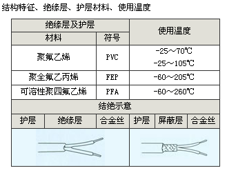 熱電偶用補償導線、補償電纜合金絲和絕緣層顏色